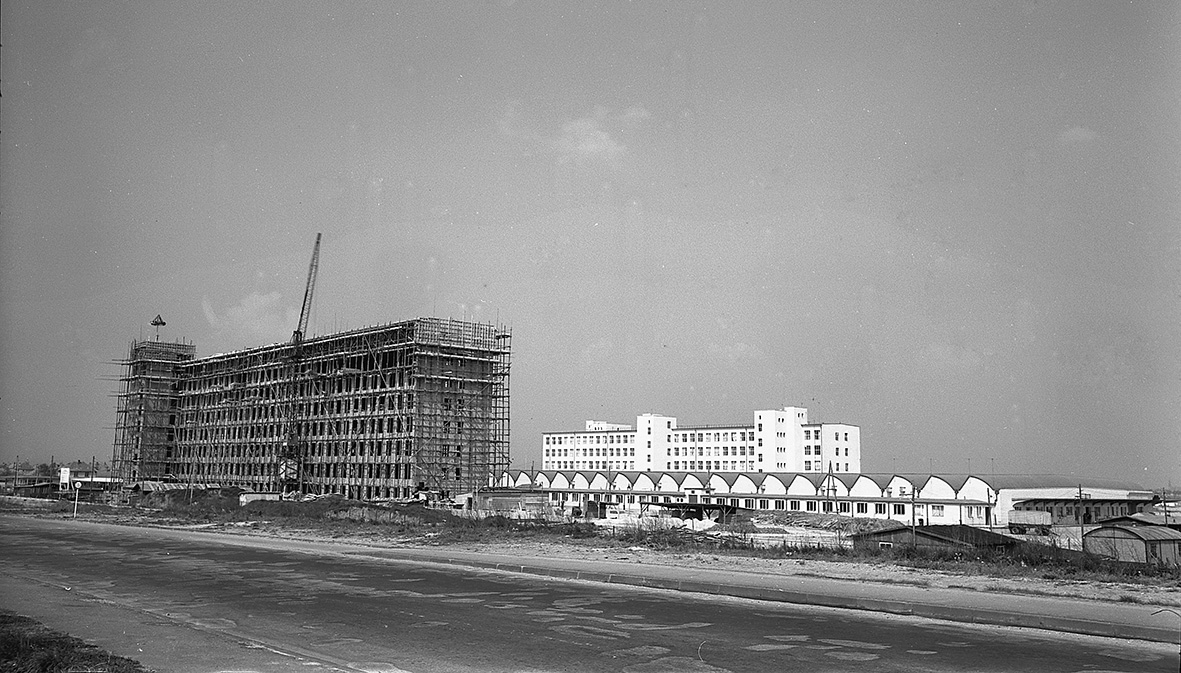Richtfest für das im 2. Bauabschnitt erstellte neue achtgeschossige Werksgebäude des Wernerwerks für Meßtechnik, rechts das Wernerwerk für Radiotechnik, April 1952, Stadtarchiv Karlsruhe 8/BA Schlesiger A2/12/6/5.