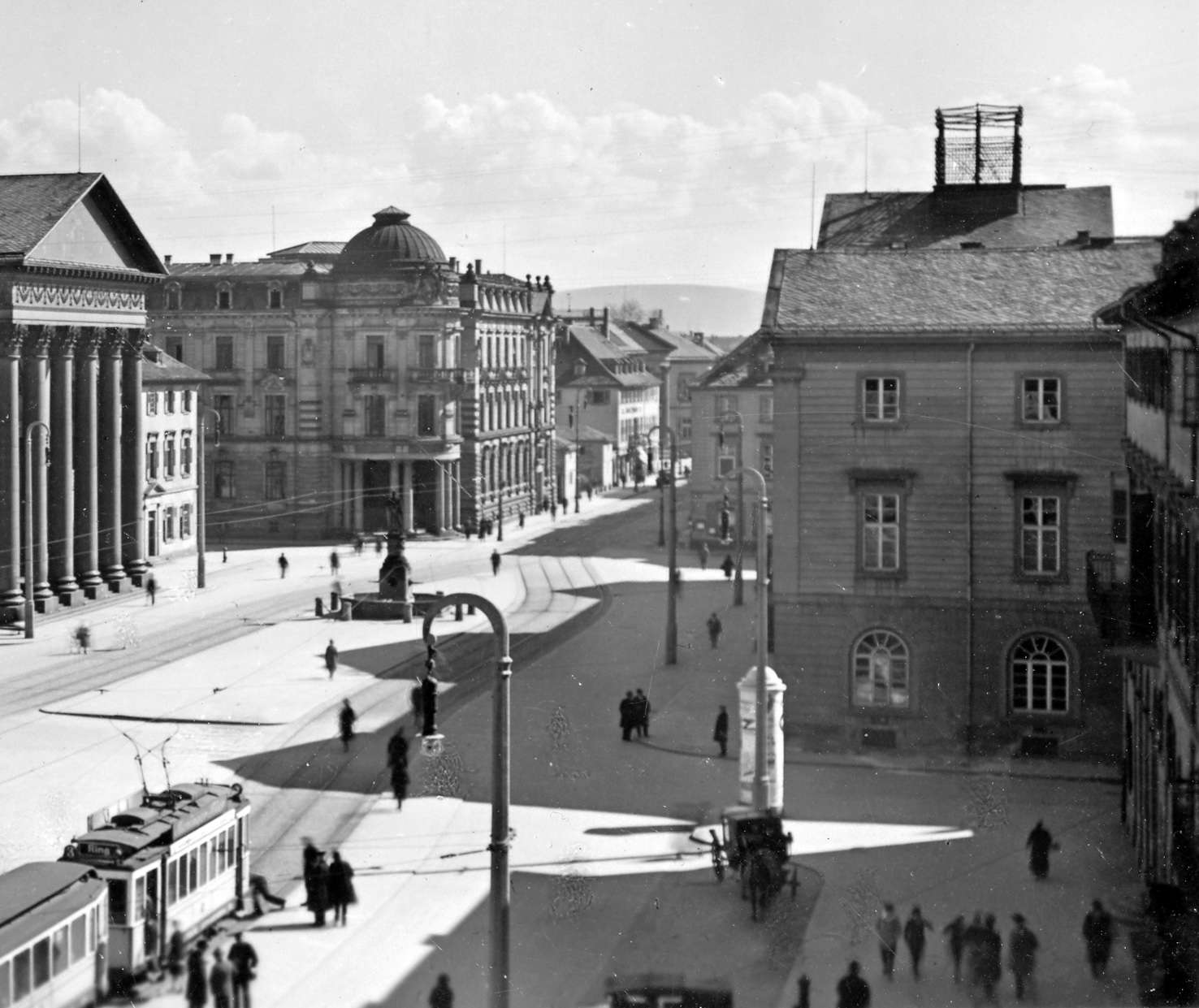 Markplatz mit Blick auf das Bezirksamt, in dem das Landespolizeiamt untergebracht war, 1930, Stadtarchiv Karlsruhe 8/Bildstelle III 1556 (Ausschnitt).