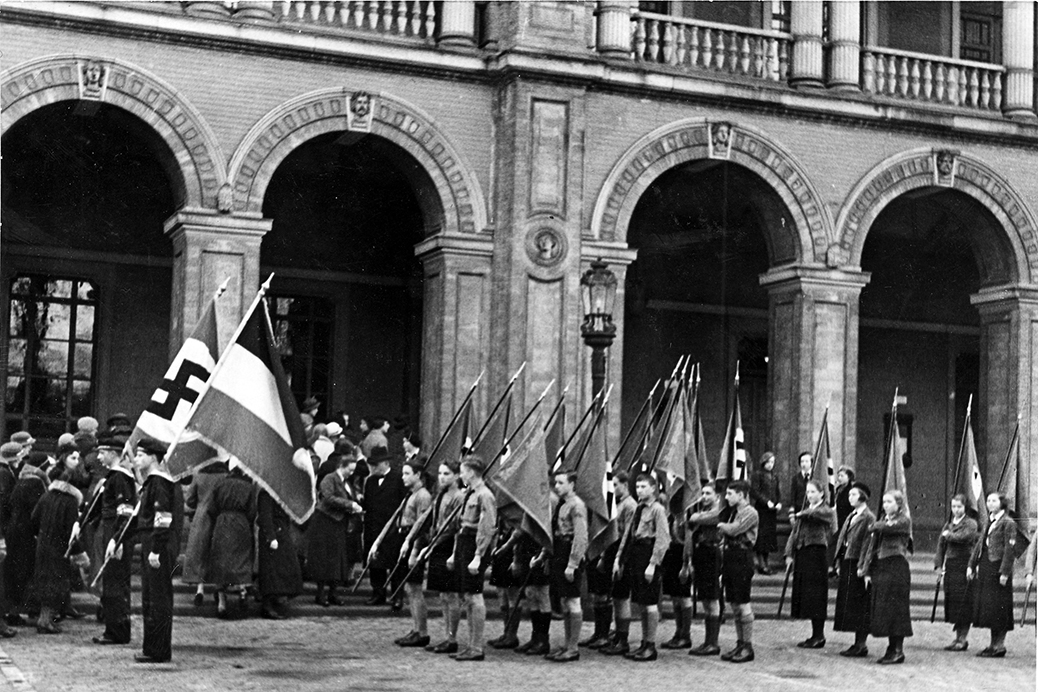 Hitlerjugend vor dem Badischen Landestheater, 1. Mai 1937, Stadtarchiv Karlsruhe 8/Alben 5/111a.