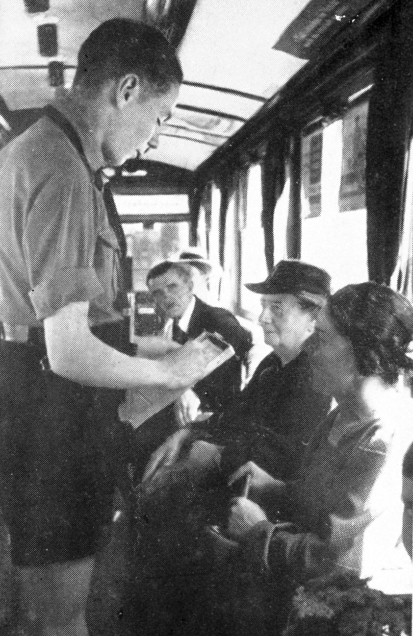 Hitlerjungen helfen als Straßenbahnschaffner aus, 1940, Stadtarchiv Karlsruhe 8/Alben 5/336b.