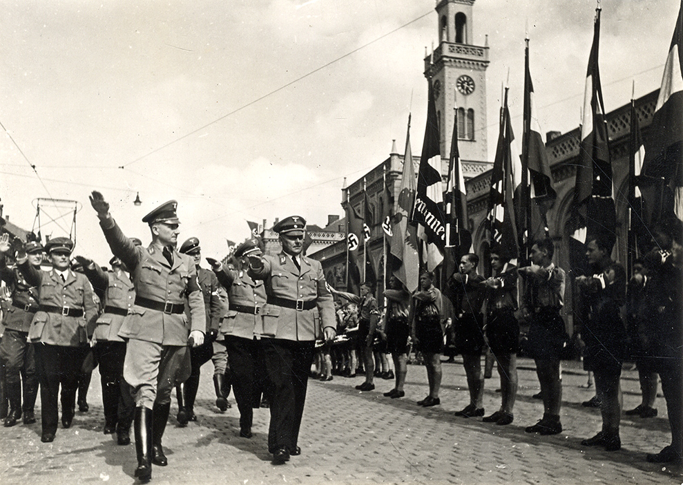 Reichsfachschaftsleiter des Reichsbundes der Deutschen Beamten (RDB) Hermann Neef mit Gauleiter Robert Wagner vor dem alten Bahnhof mit einer Fahnenabteilung der Hitlerjugend, um 1940, Stadtarchiv Karlsruhe 8/Alben 90/10.