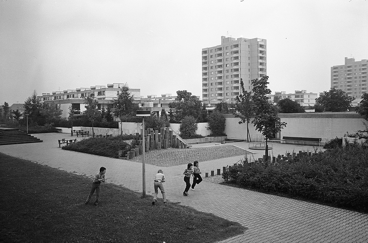 Blick über die Baumgartensiedlung mit Flachbauten und Hochhaus von Südwesten 1973, Stadtarchiv Karlsruhe 8/BA Schlesiger A26/73/6/38.