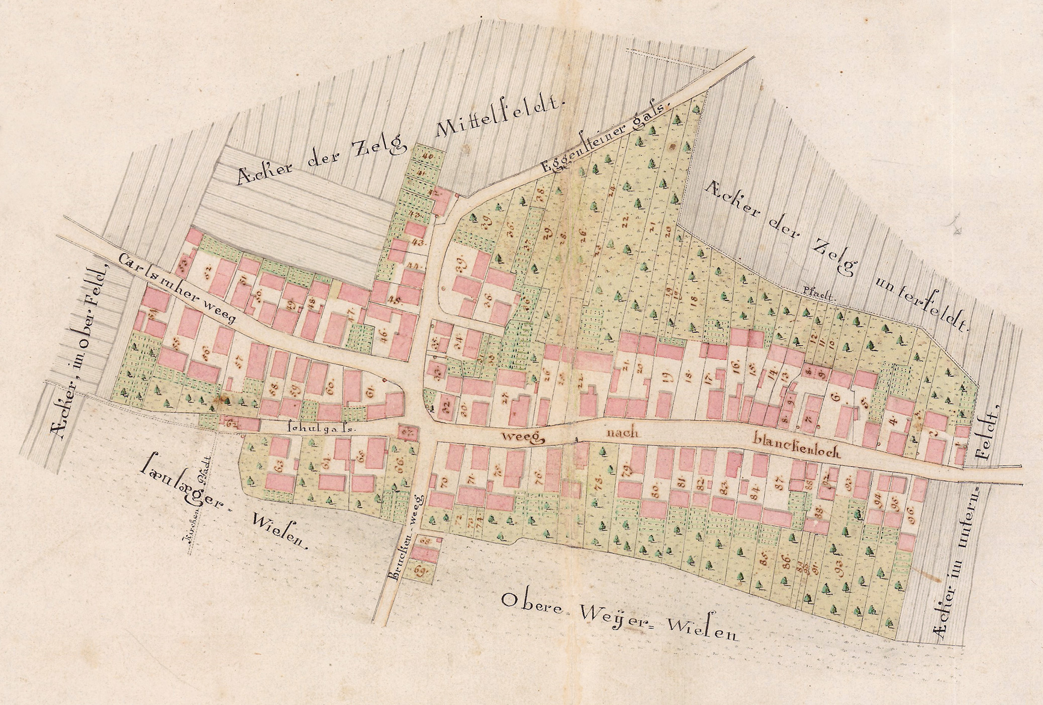 Plan über das Dorf und die beiliegenden Gärten zu Hagsfeld, 1762, Stadtarchiv Karlsruhe 5/Hagsfeld P4.