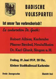 | 12:24, 1. Sep. 2016 | Ins-0738.jpg (Datei) | 76 KB | Stadtarchiv3 | Einladungsplakat der BVP zur politischen Aussprache am 19. Juni 1959 im kleinen Saal der Karlsruher Stadthalle, Stadtarchiv Karlsruhe 8/PBS X 2323. | 1 | |