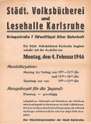 | 16:45, 25. Jan. 2017 | Ins-0809 2.jpg (Datei) | 215 KB | Stadtarchiv3 | Plakat Wiedereröffnung der Städtischen Volksbücherei und Lesehalle Karlsruhe, 1946, Stadtarchiv Karlsruhe 8/PBS X 2771. | 1 | |